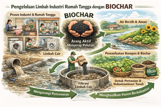 Pertumbuhan industri rumah tangga di Indonesia, seperti usaha pengolahan pangan, kerajinan, dan produksi skala kecil lainnya, memberikan kontribusi signifikan terhadap perekonomian lokal. Namun, di balik manfaat tersebut, industri rumah tangga juga menghasilkan limbah cair, padat, dan gas yang berpotensi mencemari lingkungan apabila tidak dikelola dengan baik. Salah satu pendekatan yang mulai banyak dikaji dan diterapkan sebagai solusi ramah lingkungan adalah penggunaan biochar dalam pengelolaan limbah industri rumah tangga.