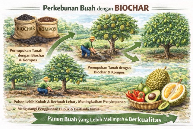 Biochar adalah bahan organik kaya karbon yang dihasilkan melalui proses pirolisis, yaitu pemanasan bahan biomassa seperti limbah pertanian, serasah tanaman, atau kayu pada suhu tinggi dengan oksigen terbatas. Biochar memiliki sifat fisik, kimia, dan biologis yang unik, sehingga dapat digunakan sebagai pembenah tanah yang efektif. Dalam konteks perkebunan buah, seperti durian, alpukat, dan rambutan, biochar dapat memberikan manfaat signifikan bagi kesuburan tanah, pertumbuhan pohon, kualitas buah, dan produktivitas jangka panjang.
