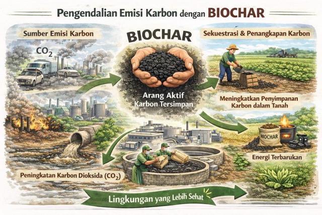Biochar adalah bahan organik padat yang dihasilkan melalui proses pirolisis, yaitu pemanasan biomassa pada suhu tinggi dengan kondisi oksigen terbatas. Biomassa yang digunakan bisa berupa limbah pertanian, sisa tanaman, serasah kayu, atau limbah organik lainnya. Struktur berpori biochar dan kandungan karbon yang stabil membuatnya memiliki kemampuan unik dalam menyerap air, menahan nutrien, dan yang terpenting, menyimpan karbon dalam jangka waktu lama. Salah satu manfaat penting biochar yang semakin mendapat perhatian adalah potensinya dalam menekan polusi dan emisi karbon, sehingga berperan dalam mitigasi perubahan iklim dan peningkatan kualitas lingkungan.